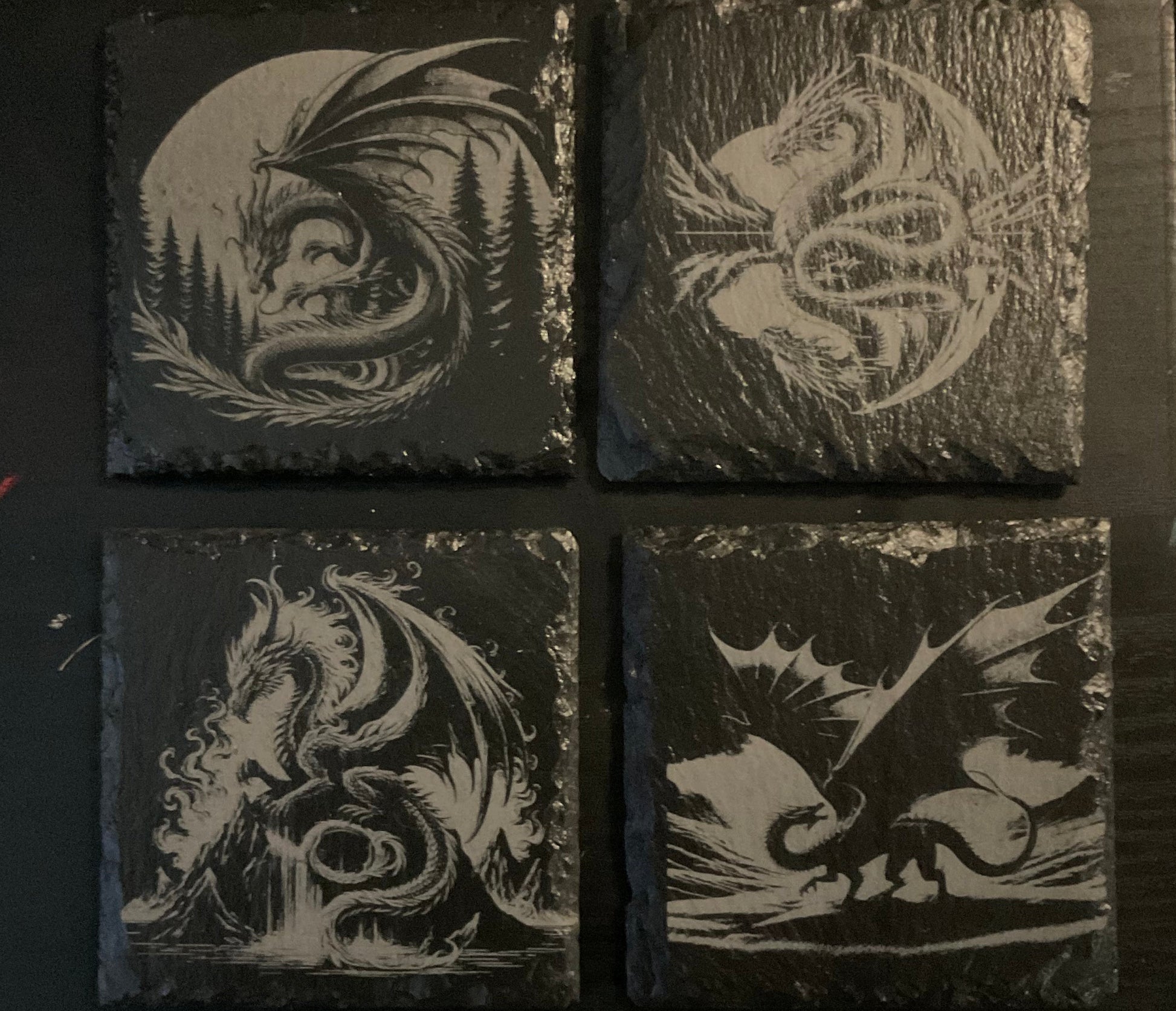 Laser Engraved Slate Coasters -Dragons- SET OF 4